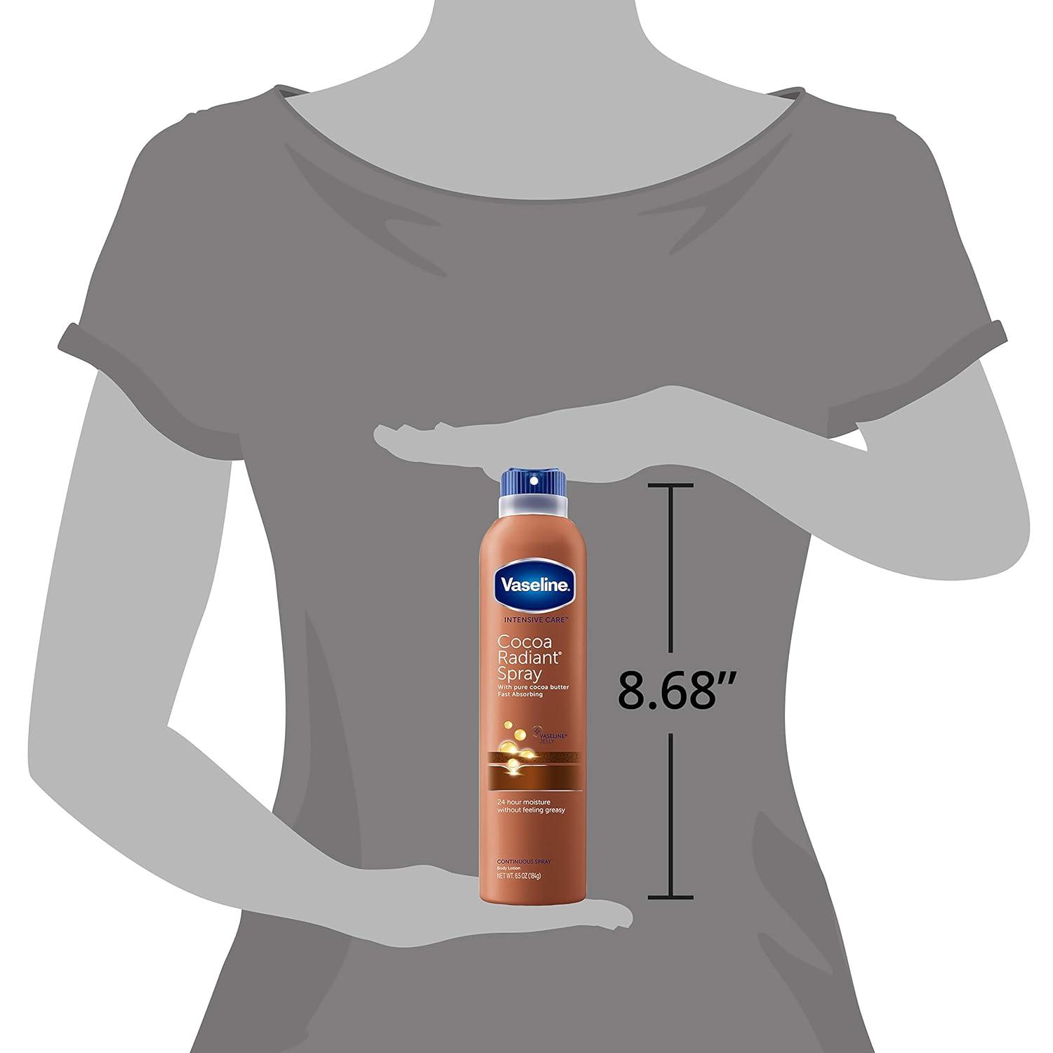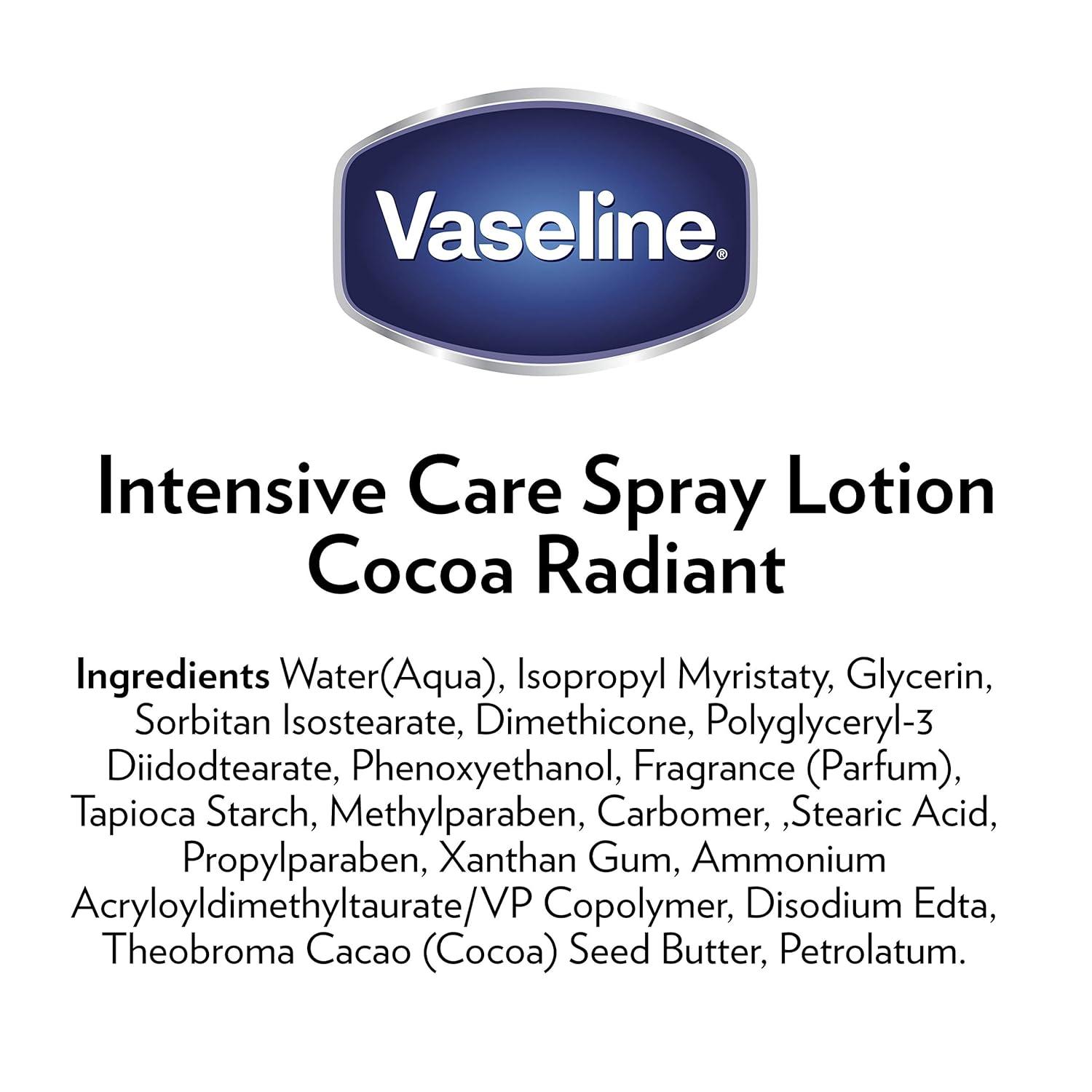 100 PERCENT RADIANT: Vaseline Intensive Care Cocoa Radiant Spray On Lotion is formulated with 100 percent pure cocoa butter to hydrate dry skin by revealing its natural radiance